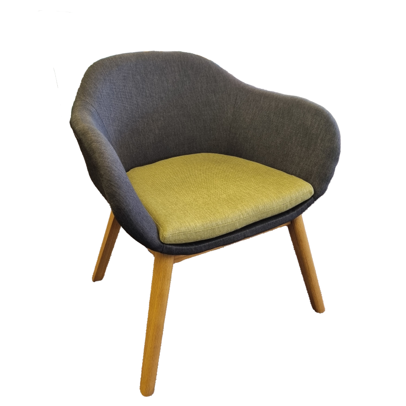 This armchair features a smooth, curved shape upholstered in durable fabric. It showcases a customisable two-tone color palette, bringing a subtle yet striking contrast to your space.
