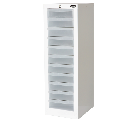 Powdercoated Steel Frame and Polycarbonate Drawers. Ideal for Stationery and Brochure Storage.